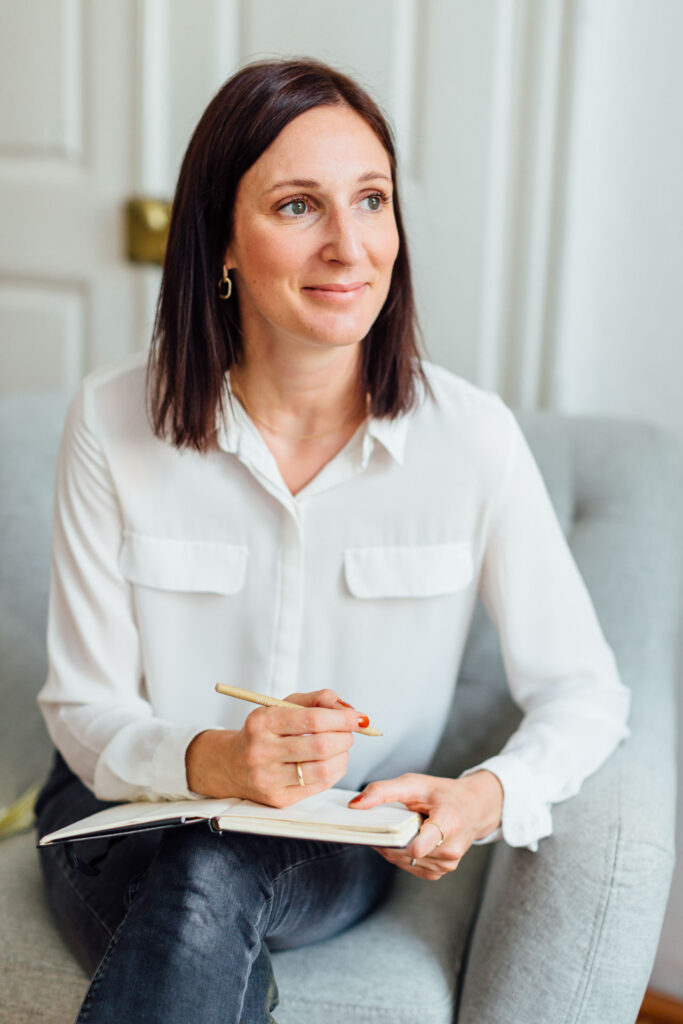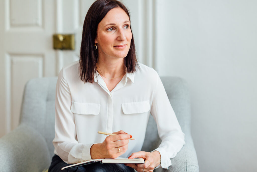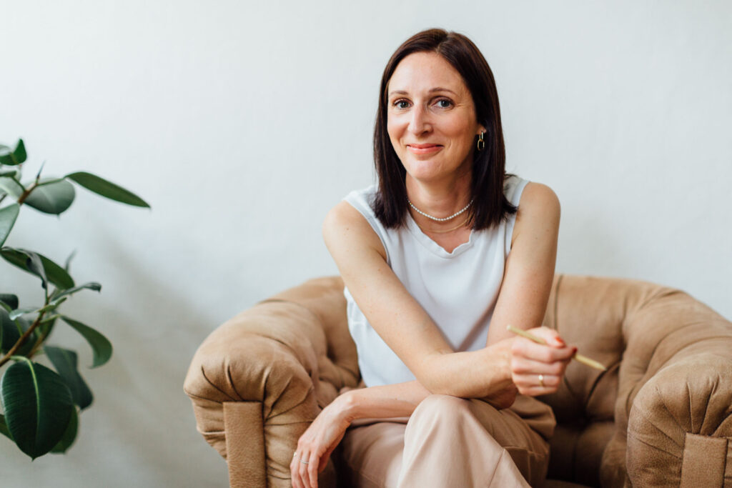 Frau sitzt am Sessel im Zukunftsstudio in Linz bei Mag. Eva Schrotter Unternehmensberatung Mediation Coaching